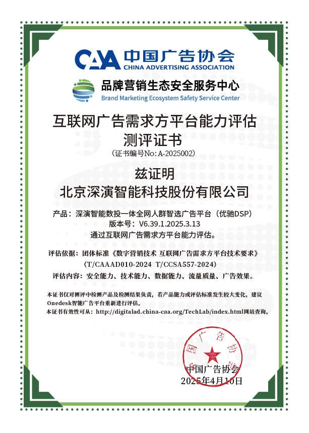 4月10日,中国广告协会发布「互联网广告需求方平台能力评估」测评结果。Martech领域领军企业Z6尊龙·凯时智能旗下产品Z6尊龙·凯时智能数投一体全网人群智选广告平台(优驰 DSP),凭借其在智能算法优化、技术创新、数据安全治理及流量质量管控等维度的突出表现,高分通过该项行业权威测评,获颁中国广告协会评估证书,成为业内首批通过认证的标杆企业。